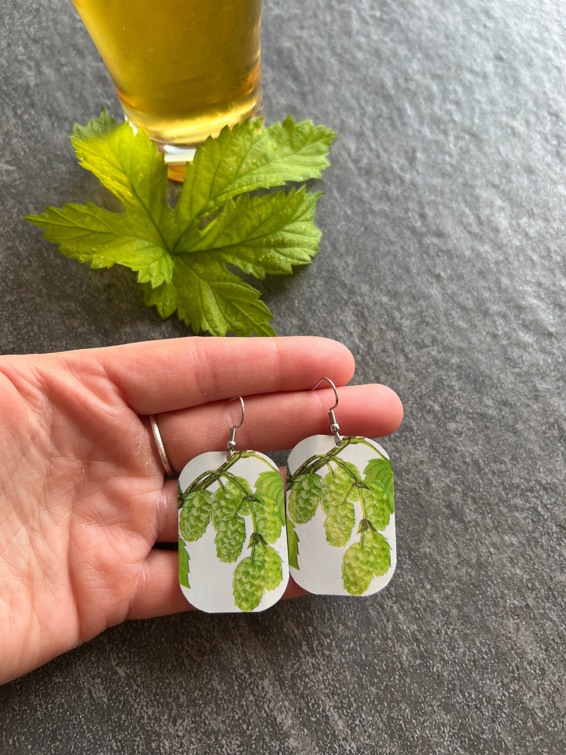 1.5" tall earrings handmade from beer cans with stainless steel hooks. From Freemont Brewing's Lush IPA!