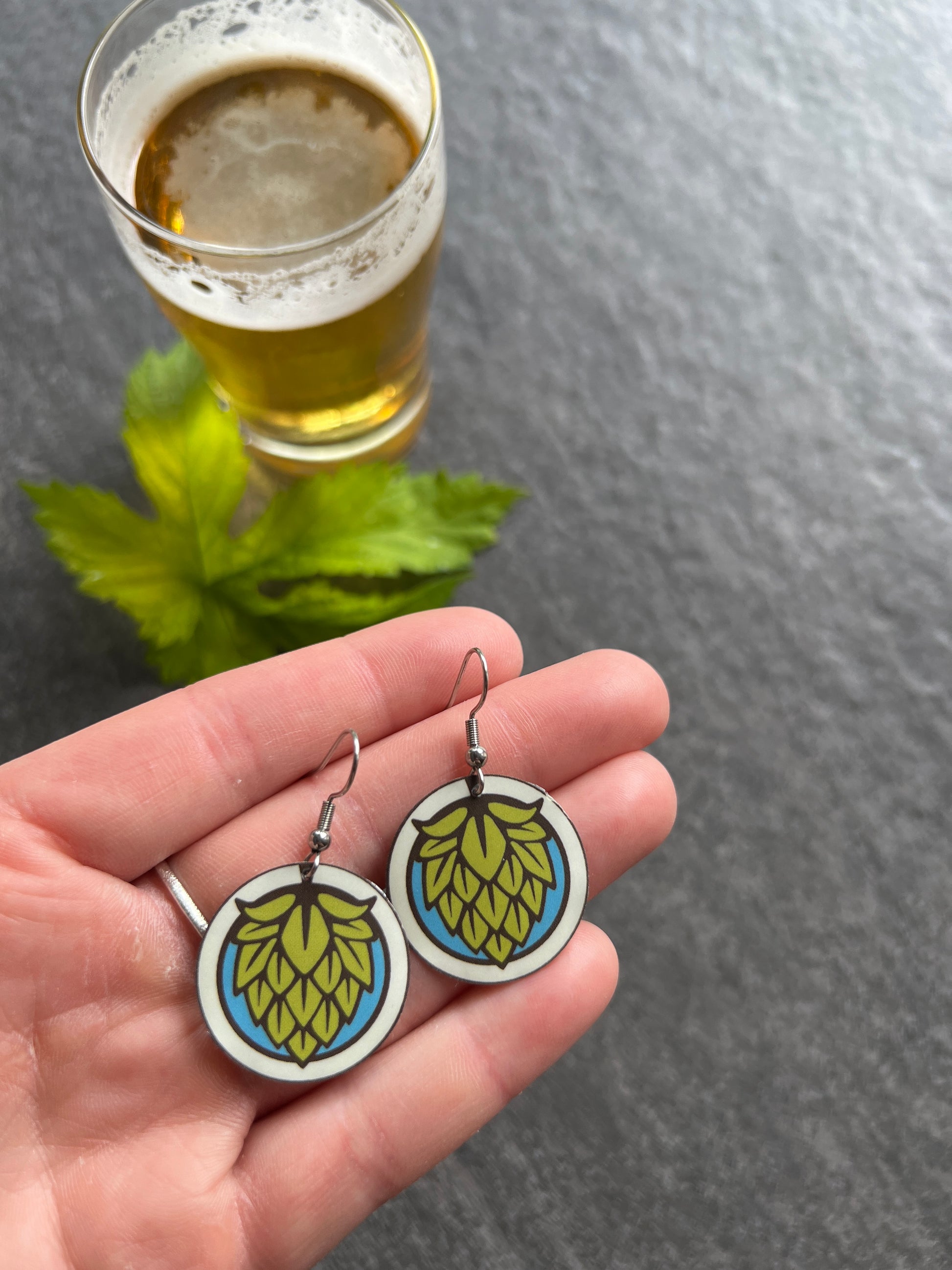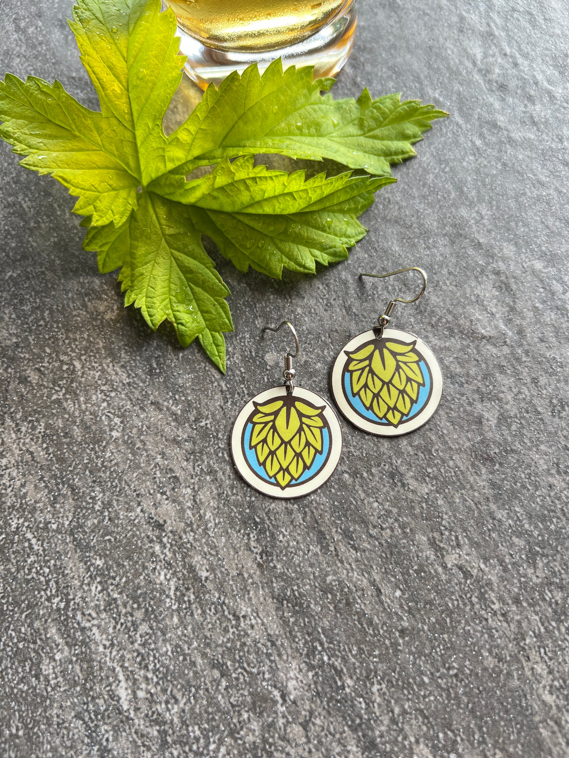 1" tall earrings handmade from beer cans with stainless steel hooks. From Bitter Root Brewing's Single Hop Pale Ale!