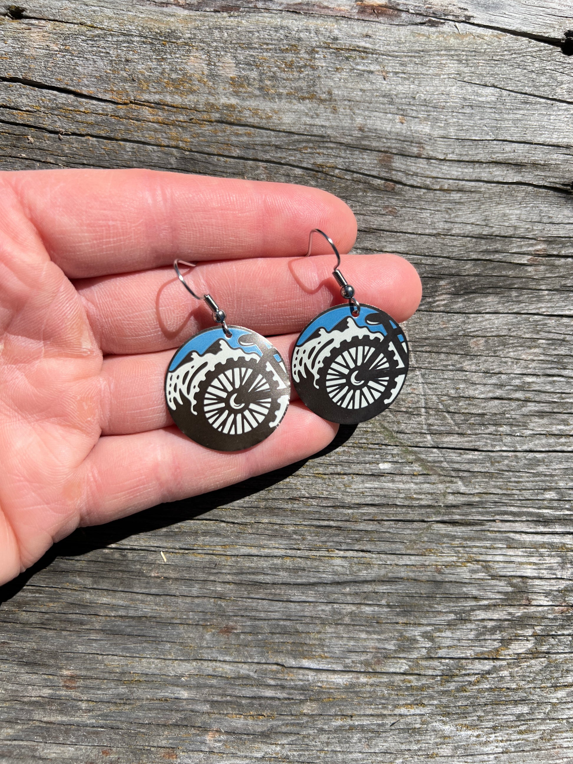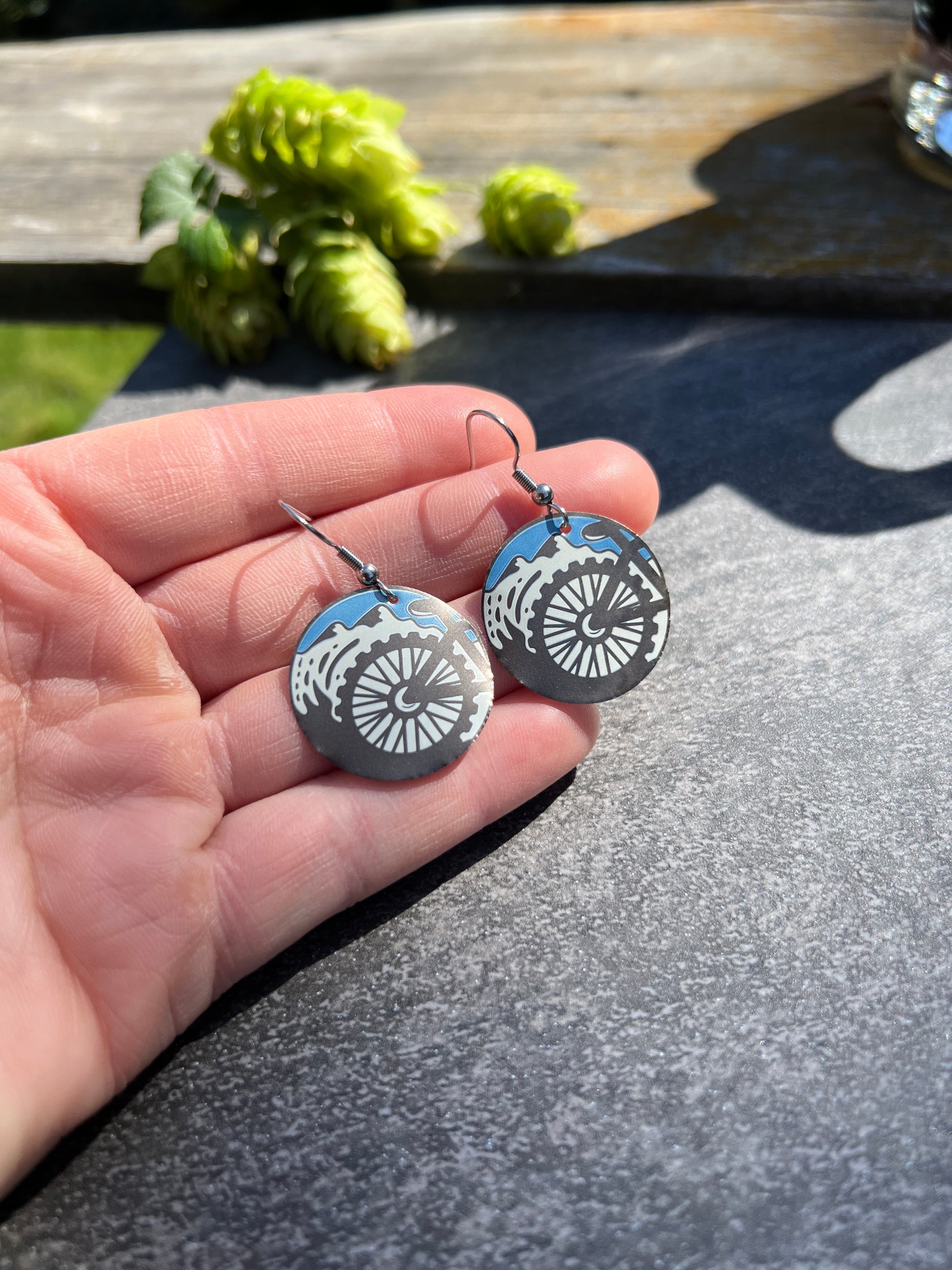 1" tall earrings handmade from beer cans with stainless steel hooks. From Bitter Root Brewing's Dirt Church!